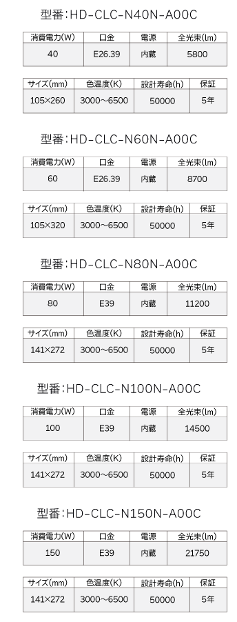 ※ 材質はPBT+アルミ+PC、電圧はフリーボルト(AC100-277V)、